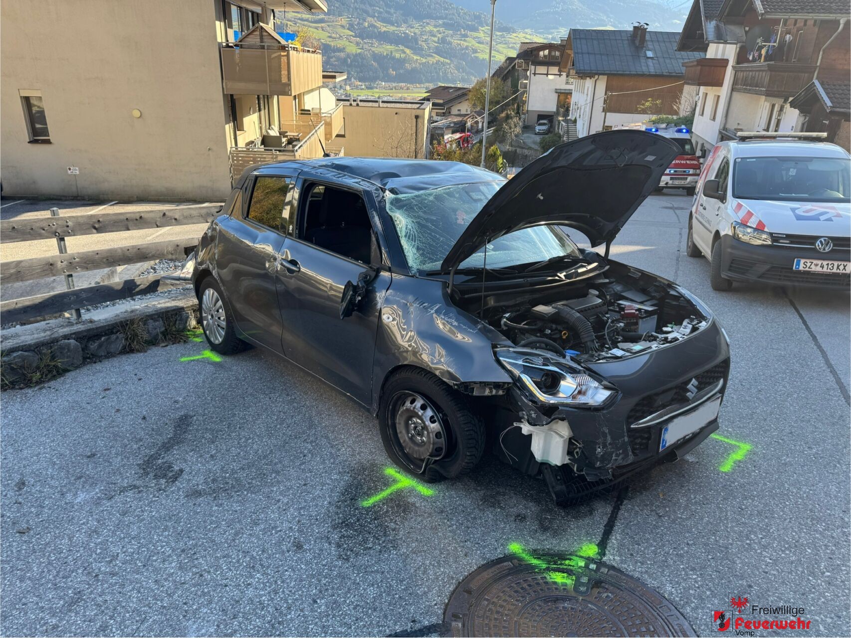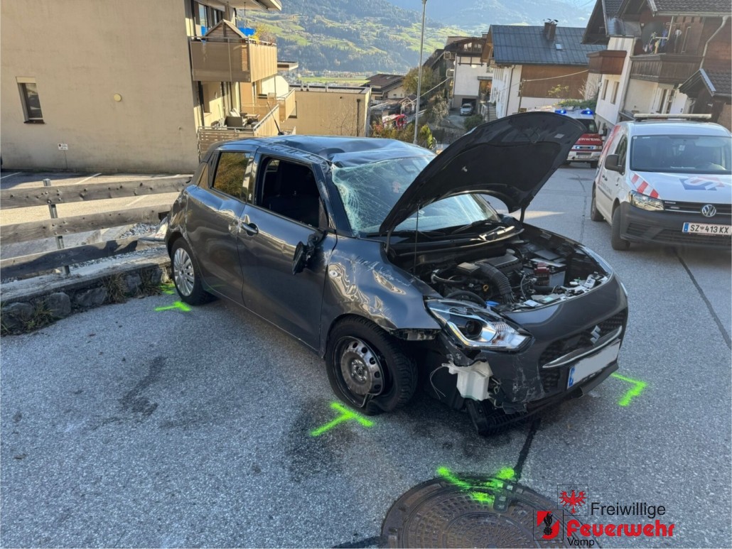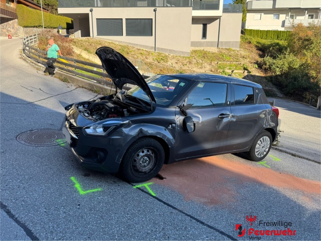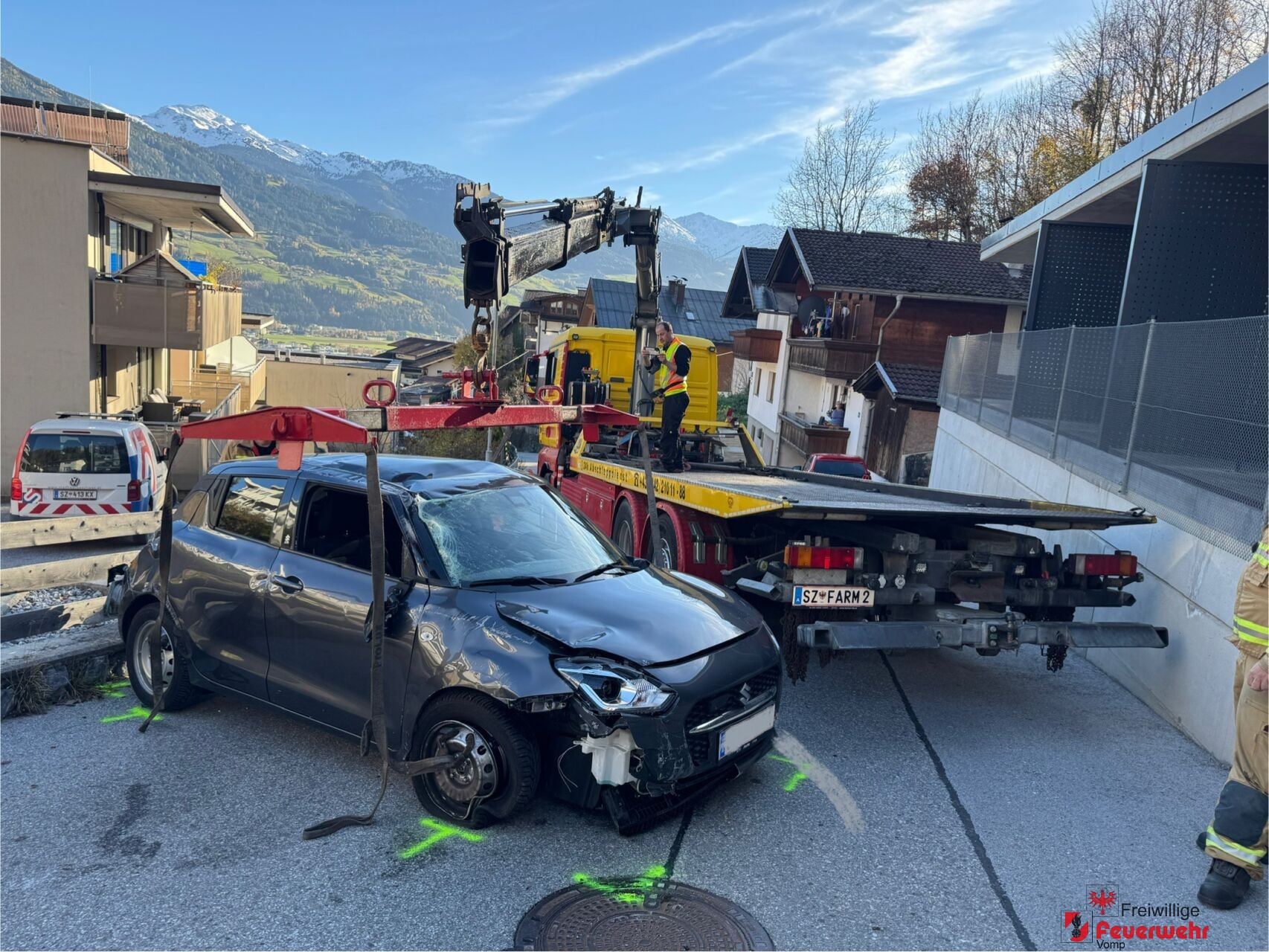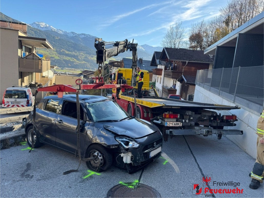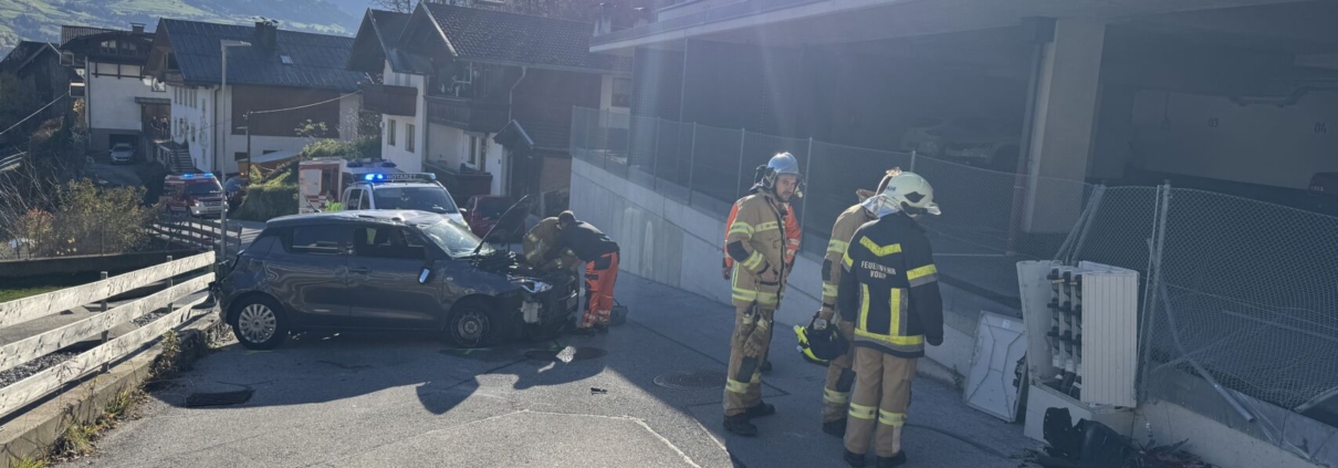 Am 4. November wurde die Feuerwehr Vomp gegen 13:45 Uhr vom Rettungsdienst mit dem Einsatzstichwort „VU – Unbekannte Situation“ nach Fiecht nachalarmiert. Beim Eintreffen an der Einsatzstelle fanden wir ein verunfalltes Fahrzeug vor, das über eine kleine Betonmauer am rechten Fahrbahnrand geraten war und in weiterer Folge sich überschlagen hatte. Der Lenker wurde vom Notarzt und dem Rettungsdienst versorgt und mit Verletzungen unbestimmten Grades in das Bezirkskrankenhaus Schwaz eingeliefert.